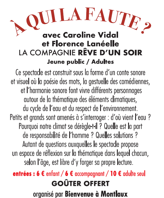 - Dimanche 30 novembre à 16h, spectacle ” A qui la faute” pour tous à partir de 4 ans, sur le thème de l’eau son cycle et le respect de l’environnement. proposé par bienvenue à Montlaux.